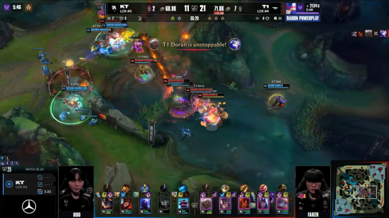 T1Àº ¿¬´Þ¾Æ 5¼¼Æ®¿¡¼ ½Â¸®ÇÏ¸ç ¿ªÀü ¿ì½ÂÀ» ÀÌ·ï³Â´Ù. T1Àº ·¹¿À³ª¿Í °¥¸®¿À¸¦ ±â¿ëÇØ À¯Áö·ÂÀ» ²ø¾î¿Ã·È°í, ¹Ý¸é KT´Â ž ¶óÀ̳ʷΠ±â¿ëÇÑ ¿ä¸¯ÀÌ ÇÑŸ ±³Àü¿¡¼ À¯ÀǹÌÇÑ È°¾àÀ» ÇØ³»Áö ¸øÇϸç KT°¡ ÀϹæÀûÀ¸·Î ¹Ð·Á³ª´Â ±¸µµ°¡ Çü¼ºµÆ´Ù. ¼´ë±æ ¼±¼ö°¡ ÀûÀýÇÑ Á÷½º Ȱ¿ëÀ¸·Î ½Ã°£À» ¹ú±âµµ ÇßÀ¸³ª, °á±¹ ¼¼Æ® ½ÃÀÛ 37ºÐ °æ ÇÑŸ ±³Àü¿¡¼ T1ÀÌ ´ë½ÂÀ» °ÅµÎ¸ç ±×´ë·Î ¼¼Æ®°¡ Á¾·áµÆ´Ù.