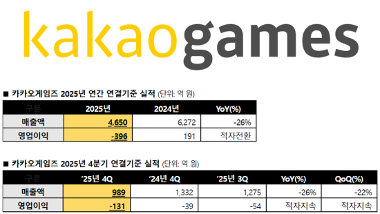 [īī¿À°ÔÀÓÁî] 2025³â ¿¬°£ ¿¬°á ¸ÅÃâ 4,650¾ï ¿ø, ¿µ¾÷¼Õ½Ç ¾à..  (0)  2026-02-11