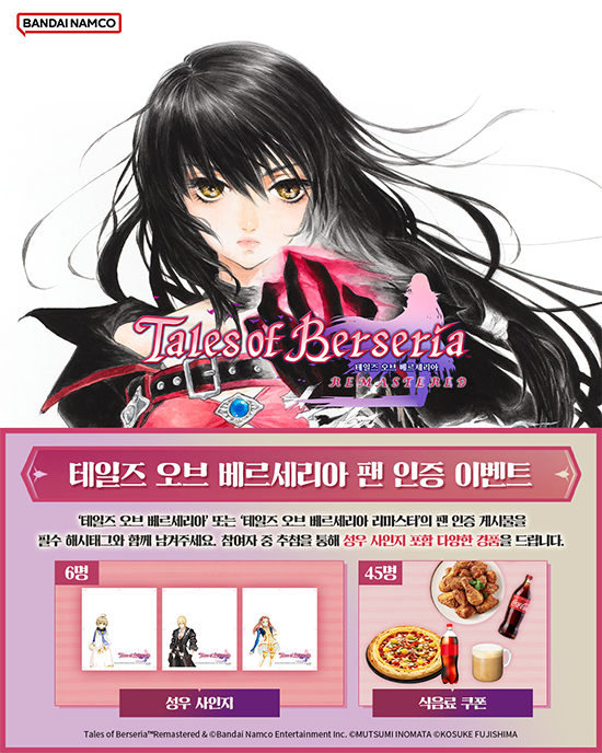 ¡®Å×ÀÏÁî ¿Àºê º£¸£¼¼¸®¾Æ ¸®¸¶½ºÅÍ¡¯(Çѱ¹¾îÆÇ)ÀÇ ¹ß¸Å¸¦ ±â³äÇØ, ¹Ý´ÙÀ̳²ÄÚ ¿£ÅÍÅ×ÀÎ¸ÕÆ® ÄÚ¸®¾ÆÀÇ X ä³Î(https://x.com/BandaiNamcoKR)¿¡¼ ÆÒ ÀÎÁõ À̺¥Æ®¸¦ ÁøÇàÇÑ´Ù. ¡®Å×ÀÏÁî ¿Àºê º£¸£¼¼¸®¾Æ¡¯ ¶Ç´Â ¡®Å×ÀÏÁî ¿Àºê º£¸£¼¼¸®¾Æ ¸®¸¶½ºÅÍ¡¯ÀÇ ÆÒ ÀÎÁõ °Ô½Ã¹°À» Çʼö ÇØ½ÃÅÂ±×¿Í ÇÔ²² Æ÷½ºÆÃÇϸé, Ãß÷À» ÅëÇØ 'Å×ÀÏÁî ¿Àºê º£¸£¼¼¸®¾Æ'ÀÇ ¼º¿ì »çÀÎÁö(6¸í), ÇÇÀÚ ÄíÆù(10¸í), ġŲ ÄíÆù(14¸í), Ä¿ÇÇ ÄíÆù(20¸í)À» ÁõÁ¤ÇÑ´Ù. ÇØ´ç À̺¥Æ®´Â 3¿ù 2ÀÏ(¿ù)±îÁö ÁøÇàµÉ ¿¹Á¤ÀÌ´Ù.