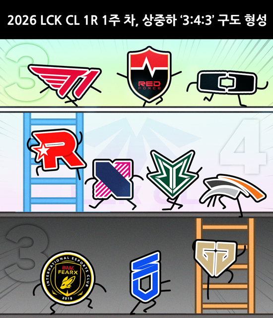 ¶óÀ̾ù °ÔÀÓÁî ¡®¸®±× ¿Àºê ·¹Àüµå(LoL)¡¯ ±¹³» Á¤±Ô e½ºÆ÷Ã÷ ¡®LoL èÇǾ𽺠ÄÚ¸®¾Æ(LCK)¡¯ °ø½Ä 2±º ´ëȸ ¡®LCK 縰Àú½º ¸®±×(CL)¡¯ 2026³â 1¶ó¿îµå(R) 1ÁÖ Â÷ °æ±â°¡ 3¿ù 30ÀϺÎÅÍ 4¿ù 3ÀϱîÁö ¿­·È´Ù. »óÀ§±Ç 3ÆÀ¡¤ÁßÀ§±Ç 4ÆÀ¡¤ÇÏÀ§±Ç 3ÆÀÀ¸·Î ³ª´µ´Â ¡®3:4:3¡¯ ±¸µµ°¡ Çü¼ºµÆ´Ù. 2ÁÖ Â÷ °æ±â´Â 4¿ù 6ÀϺÎÅÍ 10ÀϱîÁö ÁøÇàµÈ´Ù.