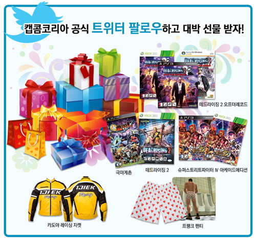 1. ±â°£ : 2011³â 10¿ù 12ÀÏ ~ 10¿ù 31ÀÏ 2. ³»¿ë : À§ ±â°£ µ¿¾È ĸÄÞÄÚ¸®¾ÆÀÇ °ø½Ä Æ®À§Å͸¦ ÆÈ·Î¿ìÇϰí, ¾÷µ¥ÀÌÆ®µÇ´Â Æ®À ±ÛÀ» ¸®Æ®À(RT)ÇÑ ºÐµé Áß Ãß÷À» ÅëÇØ »óǰ ÁõÁ¤ ¡Ø ¸®Æ®ÀÀ» ¸¹ÀÌ ÇÒ¼ö·Ï ´ç÷Ȯ·üÀÌ ³ô¾ÆÁü 3. ÁõÁ¤ »óǰ (ÃÑ 16¸í) 5¸í: ¡®µ¥µå¶óÀÌ¡ 2 ¿ÀÇÁ´õ·¹Äڵ塯 ŸÀÌÆ²(PS3/Xbox 360/PC Áß ÅÃÀÏ) ¿¹ÆÇƯÀü ¡®ÇÁ·©Å© ÆÒƼ¡¯ 5¸í: ¡®½´ÆÛ½ºÆ®¸®Æ®ÆÄÀÌÅÍ ¥³ ¾ÆÄÉÀ̵忡µð¼Ç¡¯ ŸÀÌÆ²(PS3/ Xbox 360 Áß ÅÃÀÏ) 6¸í: ¡®±Ø¸¶°èÃÌ¡¯ ŸÀÌÆ²(PSP)