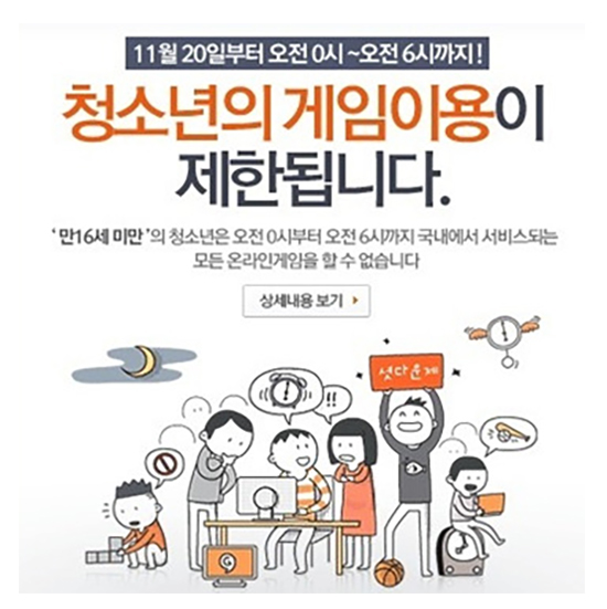 ¡®¼Ë´Ù¿îÁ¦¡¯´Â ¸¸ 16¼¼ ¹Ì¸¸ û¼Ò³âÀÌ ÀÚÁ¤ºÎÅÍ ¿ÀÀü 6½Ã±îÁö ¿Â¶óÀÎ °ÔÀÓ¿¡ Á¢¼ÓÇÏÁö ¸øÇϵµ·Ï °Á¦ÇÏ´Â ¹ýÀÌ´Ù. ¿©¼º°¡Á·ºÎ°¡ ¡®Ã»¼Ò³â º¸È£¹ý¡¯ Á¦26Á¶ Á¦1Ç×À¸·Î µµÀÔÇØ 2011³â 11¿ù 20ÀϺÎÅÍ ½ÃÇàÇØ ¿À°í ÀÖ´Â ±ÔÁ¦´Ù.