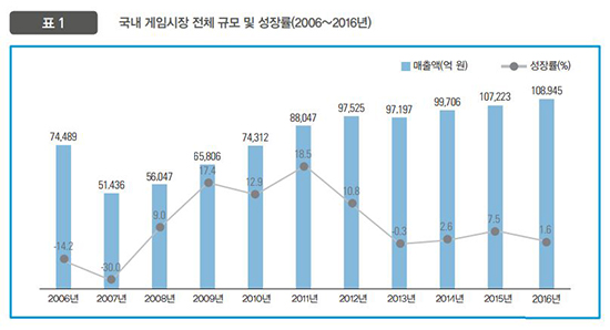 ¸¶Âù°¡Áö·Î Çѱ¹ÄÜÅÙÃ÷ÁøÈï¿øÀÌ ¹ß°£ÇÑ ¡®´ëÇѹα¹ °ÔÀÓ¹é¼(ÀÌÇÏ °ÔÀÓ¹é¼)¡¯¸¦ º¸¸é ±¹³» °ÔÀÓ ½ÃÀå Àüü ±Ô¸ð¿Í ¼ºÀå·ü º¯È¸¦ È®ÀÎÇÒ ¼ö ÀÖ´Ù. ¡®°ÔÀӹ鼡¯¿¡ µû¸£¸é 2007³â 5Á¶1õ¾ï ¿ø ±Ô¸ð¿´´ø ±¹³» °ÔÀÓ ½ÃÀåÀº 2008³â 5Á¶6õ¾ï ¿ø, 2009³â 6Á¶8õ¾ï ¿ø, 2010³â 7Á¶4õ¾ï ¿ø, 2011³â 8Á¶8õ¾ï ¿øÀ» ±â·ÏÇß´Ù. ¼ºÀå·üÀ» º¸¸é 2008³â 9%, 2009³â 17.4%, 2010³â 12.9%, 2011³â 18.5%·Î ²ÙÁØÈ÷ Áõ°¡ÇÑ´Ù.