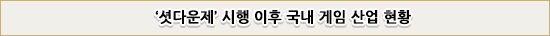 ¡®¼Ë´Ù¿îÁ¦¡¯°¡ ½ÃÇàµÈ 2011³â ÀÌÈÄ ±¹³» °ÔÀÓ ½ÃÀå ±Ô¸ð¸¦ º¸¸é 2012³â 9Á¶7õ¾ï ¿ø, 2013³â 9Á¶7õ¾ï ¿ø, 2014³â 9Á¶9õ¾ï ¿ø, 2015³â 10Á¶7¹é¾ï ¿ø, 2016³â 10Á¶7¹é¾ï ¿øÀÌ´Ù. ¼ºÀå·üÀ» º¸¸é 2012³â 10.8%, 2013³â -0.3%, 2014³â 2.6%, 2015³â 7.5%, 2016³â 1.6%·Î ¡®¼Ë´Ù¿îÁ¦¡¯ ½ÃÇà ÀüÀÎ 2008³âºÎÅÍ 2011³â±îÁö ±â·Ï°ú ºñ±³ÇØ ´ëÆø °¨¼ÒÇß´Ù.