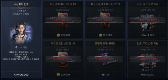 4Á¾ »Ì±â¿Í º°µµ·Î °ÔÀÓÀ» ¿øÈ°ÇÏ°Ô Ç÷¹ÀÌÇϱâ À§Çؼ± °æÇèÄ¡¸¦ Ãß°¡·Î ȹµæÇÒ ¼ö ÀÖ´Â '¼ö¼±ÈÀÇ Àεµ'¿Í °ñµå¸¦ Ãß°¡·Î ȹµæÇÒ ¼ö ÀÖ°Ô ÇØÁÖ´Â '¼ö¼±ÈÀÇ Ãູ' µÎ °¡Áö ±â°£Á¦ »óǰ¿¡ °¡ÀÔÇØ¾ß ÇÒ Çʿ䰡 ÀÖ´Ù. °¢°¢ 20,900¿ø¿¡ ÆÇ¸Å ÁßÀÌ´Ù.