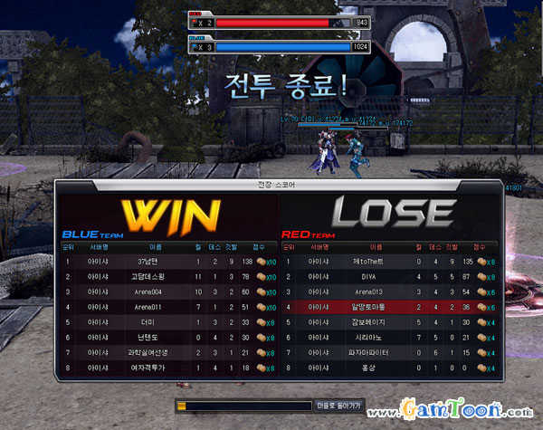 ÃÑ 1000Á¡¿¡ ¸ÕÀú µµ´ÞÇÏ´Â ÆÀÀÌ ½Â¸®ÇÏ°Ô µÇ¸ç ÆÀ Àü¼ö´Â ±ê¹ß Á¡¼ö¿Í °³ÀÎÁ¡¼ö(»óÅ ÆÀ ij¸¯Å͸¦ Á׿´°Å³ª ±ê¹ß Á¡·É µî ij¸¯ÅͰ¡ ¾ò´Â Á¡¼ö) µî ´Ù¾çÇÑ È¯°æ¿¡¼ ÃæÁ·µÇ°Ô µÇ¸ç °¢ ÆÀ ³»¿¡¼ÀÇ ¼øÀ§´Â °³ÀÎÁ¡¼ö¿¡ µû¶ó °áÁ¤µÈ´Ù.