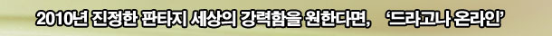 ¡®µå¶ó°í³ª ¿Â¶óÀΡ¯Àº µå·¡°ïÀ̶ó´Â ¼ÒÀ縦 źźÇÑ ±¸¼º°ú ½Ã³ª¸®¿À ÀÛ¾÷À» ÅëÇØ ¿Â¶óÀÎ °ÔÀÓÀ¸·Î ź»ý½ÃŲ ÀÛǰÀÌ´Ù. µ¿¼¾çÀ» ¸··ÐÇϰí Àý´ë ÈûÀÇ »ó¡À̾ú´ø ¡®µå·¡°ï¡¯, ´©±¸³ª ÇѹøÂëÀº ²Þ²ã¿Ô´ø »õ·Î¿î Èû¿¡ ´ëÇÑ µ¿°æ, ÀÌ·¯ÇÑ Àΰ£ÀÇ ²ÞÀ» ¿Â¶óÀÎ °ÔÀÓ ¼Ó¿¡ ¿Å°Ü³õÀº °ÍÀÌ ¹Ù·Î ¡®µå¶ó°í³ª ¿Â¶óÀΡ¯ÀÌ´Ù. °ÔÀÓ ¼¼»ó¿¡¼ ÆîÃÄÁö´Â Àû°úÀÇ ²÷ÀÓ¾ø´Â ÀüÀï, 100:100ÀÇ ´ë±Ô¸ð ÀüÀåÀÌ ÆîÃÄÁö´Â ÃàÁ¦ÀÇ ´ëÀü, ²÷ÀÓ¾øÀÌ ÆîÃÄÁö´Â ¿ì¿¬°ú ºÒÈ®½Ç¼ºÀÇ Â¥¸´ÇÔ, ÃßÈÄ °ø°³ ¿¹Á¤ÀÎ °ø¼ºÀüÀÇ ÃÖÁ¾ ½Â¸®ÀÚ·Î½á ´©¸± ¼ö ÀÖ´Â Àý´ë °ÀÚÀÇ ÆÄ¿ö, ÀÌ·¯ÇÑ ´Ù¾çÇÑ Áñ°Å¿òÀÇ ÄÜÅÙÃ÷·Î 2010³â °ÔÀÓ À¯Àú¿¡°Ô À¯Àúµé¿¡°Ô ÀÎÁ¤¹Þ´Â ¿Â¶óÀÎ °ÔÀÓÀÌ µÉ °ÍÀ¸·Î ±â´ëÇØ º»´Ù.