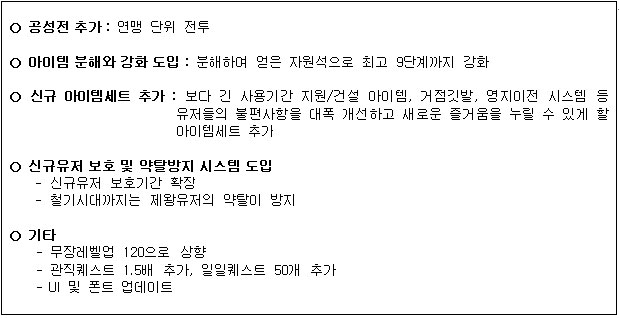 1. ±âÁ¸ µ¿ÀÏ ¾ÆÀÌÅÛ¿¡¼ ±â°£°ú ¼ö·®ÀÌ È®´ëµÈ ¾ÆÀÌÅÛÀ» Ãß°¡ 2. º¸¼®º¸¹°»óÀÚ 5°³ ¼¼Æ® 3. ÀÚ¿øÁõ°¡ 30ÀÏ, °Ç¼³½½·Ô 30ÀÏ 4. ±â¸°¸ÁÅä 7ÀÏ, ÇöȲűرê¹ß 7ÀÏ 5. ¿µÁöÀÌÀü±Ç – ¿øÇÏ´Â ±¸¿ªÀ¸·Î ¿µÁö¸¦ ÀÌÀüÇÒ ¼ö ÀÖ´Â ¾ÆÀÌÅÛ 6. ÀüÀï¸é¿ª 24½Ã°£