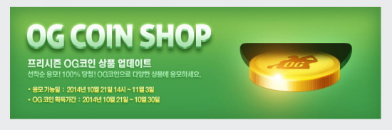 À̹ø ÇÁ¸®½ÃÁðºÎÅÍ OG Àü¿ë »óÁ¡ÀÎ OGÄÚÀμ¥ÀÌ ¿ÀǵȴÙ. OGÄÚÀÎÀ̶õ ÇÁ¸®½ÃÁð ±â°£ µ¿¾È ij¸¯ÅÍ »ý¼º ¹× °ÔÀÓ ½ÇÇà, °¢ ¸ðµå º° 9Ȧ Á¾·á, ÀÏ¹Ý ¹Ì¼Ç ¿Ï·á, ·¹º§ ´Þ¼º, ´ëȸ Âü¿© µî °ÔÀÓ ³» ´Ù¾çÇÑ ÄÜÅÙÃ÷¸¦ Áñ±â¸é¼ ȹµæÇÒ ¼ö ÀÖÀ¸¸ç, ȹµæÇÑ ÄÚÀÎÀº OGÄÚÀμ¥¿¡¼ ¿øÇÏ´Â »óǰÀ¸·Î ¼±Âø¼ø 100% ±³È¯ÀÌ °¡´ÉÇÏ´Ù.