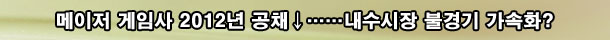 ±×·¯³ª Ȱ¹ßÇÏ°íµµ ¿¹³â°ú ´Ù¸§¾ø´Â ³Ø½¼ÀÇ °øÃ¤ ÁøÇà¿¡µµ ºÒ±¸ÇÏ°í ³Ø½¼À» Á¦¿ÜÇÑ °ÅÀÇ ¸ðµç ¸ÞÀÌÀú °ÔÀÓ»çµéÀÌ 2012³â ÇϹݱ⿡´Â °øÃ¤¸¦ ÁøÇàÇÏÁö ¾ÊÀ» °ÍÀ¸·Î º¸¿© 2ºÐ±â °ÔÀÓ¾÷°è ½ÇÀû ºÎÁø¿¡ ÀÌ¾î ²ÙÁØÈ÷ IT¾÷°è ±¸Á÷³À» ÇØ°áÇØ ÁÙ ¡®Á¥ÁÙ¡¯·Î Æò°¡¸¦ ¹Þ¾Ò´ø °ÔÀÓ¾÷°è¿¡ ºÒȲÀÇ ±×´ÃÀÌ ´õ¿í £¾îÁö´Â °ÍÀÌ ¾Æ´Ï³Ä´Â ¿ì·Á°¡ ³ª¿À°í ÀÖ´Ù.