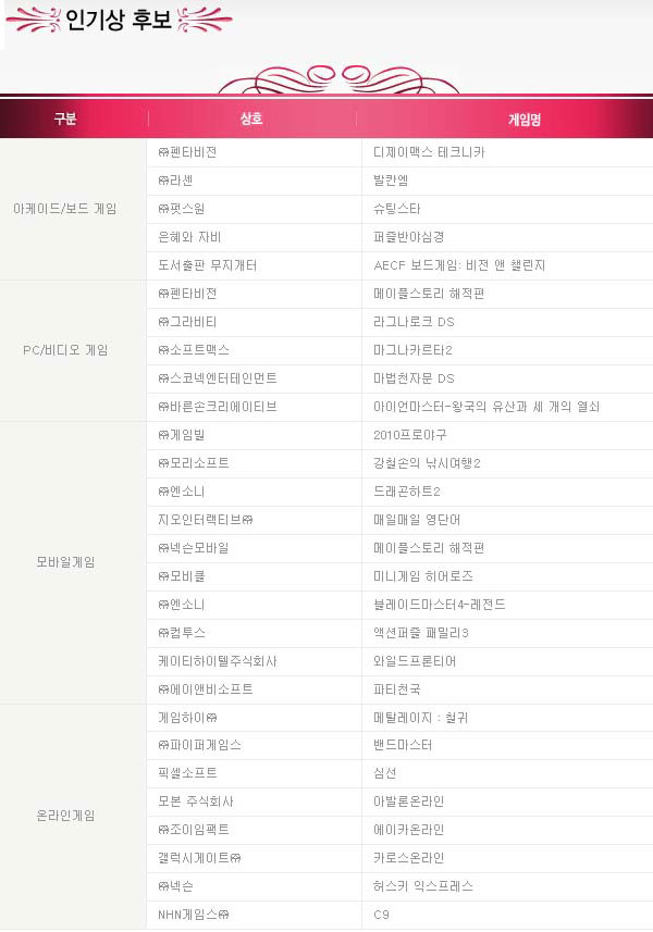 °ÔÀÓ´ë»ó °ü°èÀÚ´Â ¡°¿Â¶óÀÎ °ÔÀÓ ºÐ¾ß¿¡¼´Â Àαâ»ó ºÎ¹®ÀÌ, ¸ð¹ÙÀÏ °ÔÀÓ ºÎ¾ß¿¡¼´Â Àü ºÎ¹®ÀÌ °¢ÃàÀ» ¹úÀÏ °ÍÀ¸·Î °üÃøµÇ°í ÀÖ´Ù¡±¶ó¸ç ¡°¿Ã ÇÑ ÇØ °ÔÀÓ¾÷°è¸¦ ¸¶¹«¸®ÇÏ´Â ¿¬¸» ½Ã»ó½ÄÀ̰í ǪÁüÇÑ °æÇ°À» Á¦°øÇÏ´Â ¸¸Å, ¸¹Àº À¯ÀúµéÀÌ ÀÎÅͳݰú ¸ð¹ÙÀÏÀ» ÅëÇØ ÅõÇ¥¿¡ Âü¿©ÇØ ÁÖ½Ã¸ç ¸¹Àº °ü½ÉÀ» º¸³» ÁÖ½Ã±æ ¹Ù¶õ´Ù¡±¶ó°í ´çºÎÇß´Ù.