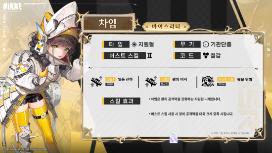 Â÷ÀÓÀº ±â°ü´ÜÃÑÀ» »ç¿ëÇϴ ö°© ¼Ó¼º ¹ö½ºÆ® II Áö¿øÇü ´ÏÄÉ´Ù. ±âÁ¸ Àαâ ij¸¯ÅÍÀÎ 'Å©¶ó¿î'À» °ÈÇÏ´Â È¿°ú¸¦ Áö´Ï°í ÀÖÀ¸¸ç, ÀçÁøÀÔ ¹ö½ºÆ® ½ºÅ³À» Áö´Ï°í Àֱ⠶§¹®¿¡ ¸¶Âù°¡Áö·Î ¹ö½ºÆ® II ´ÏÄÉÀÎ Å©¶ó¿î°ú ÇÔ²² Ȱ¿ëÇÒ ¼ö ÀÖ´Ù.